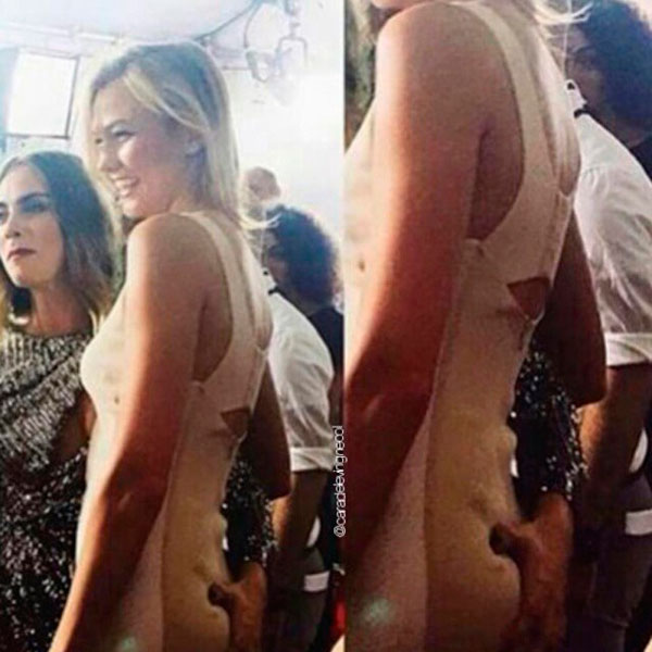 Así, como quien no quiere la cosa, mientras ambas posaban elegantes y sonrientes de cara al público, por detrás, Cara aprovechaba para meter mano a su amiga Karlie Kloss en el trasero.