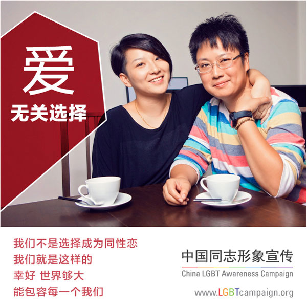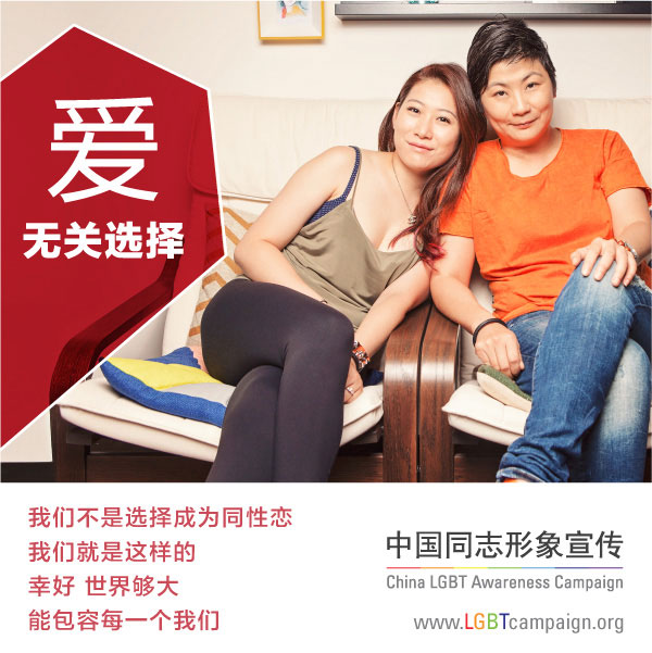Ahora que se acerca la recta final del año, no hemos querido olvidarnos de esta campaña publicitaria LGBT que se lanzó el mes de febrero pasado en China con motivo del día de los enamorados. Se titulaba ‘El amor no es una opción’ y mostraba en los anuncios a parejas reales de homosexuales en sus casas con el lema: «El amor no es una opción. Nosotros no elegimos ser homosexual. Sólo lo somos. Felizmente, el mundo es lo suficientemente grande para todos nosotros».